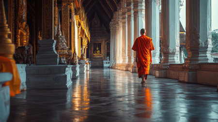 Young Buddhist monk walking in a temple courtyard at sunrise, wearing traditional orange robes, creating a serene and spiritual atmosphere