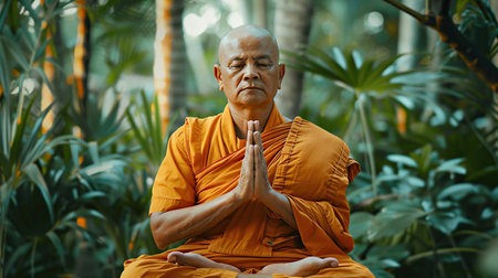Buddhist monk in lotus position against a background of green plants. Peaceful reflection and spirituality. Religion, traditional eastern meditation, prayer, spiritual practice