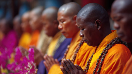 A group of monks with joined hands in prayer, exuding tranquility and spiritual depth, set in a serene outdoor sanctuary.