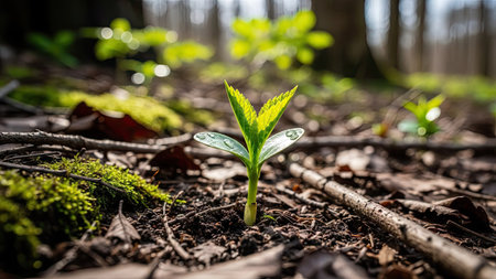 A young green sprout grows from rich soil in a natural forest setting, captured in sharp macro detail with vibrant lighting.