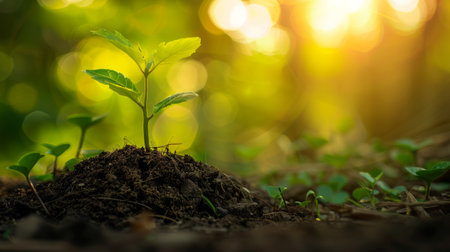 Small green plant sprouting from dark soil, symbolizing growth and renewal in natural environment. sunlight gently illuminates leaves, creating serene and hopeful atmosphere