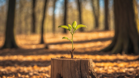 AI Generated. New sapling emerging from a tree stump in a sunlit forest during springtime