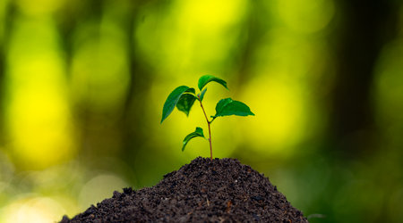 Small sprout growing from the soil with copy space and green blurred background representing new life, hope and environment conservation