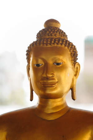 Golden Buddha statue with sunlight used for amulets of Buddhism religion. Buddhism is popular region in China Japan and south east Asia.copy space concept.
