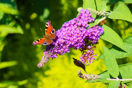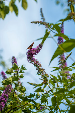 A butterfly sits on a purple butterfly bush in the garden in summer