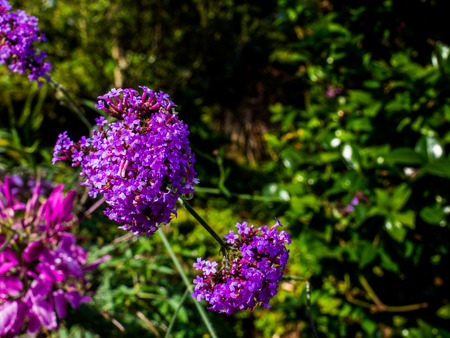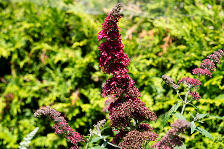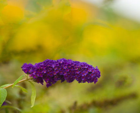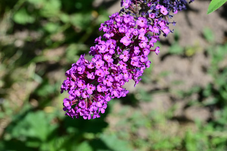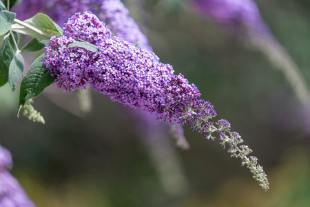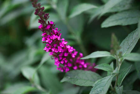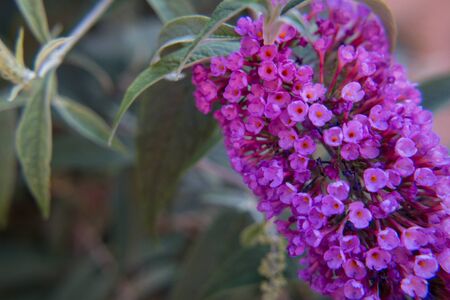 Abstract of a beautiful magenta Butterfly bush, Buddleia davidii, growing in a flower garden. Extreme shallow depth of field with blurred foreground and background.
