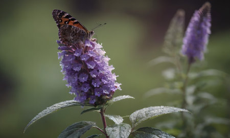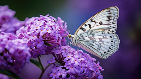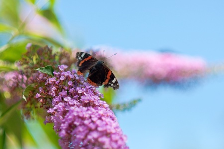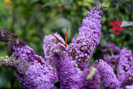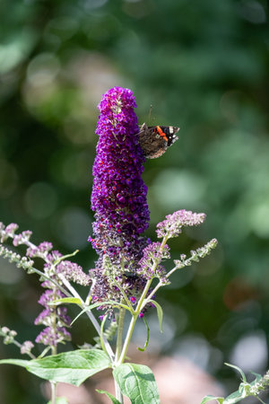A butterfly collecting pollen from a purple budlea, or Budlea flower, also known as a butterfly bush.