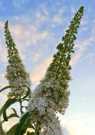 White flower, panicles of Buddleja davidii 'White Profusion'. Flowers (Buddleja davidii 'White Profusion'), also known as butterfly bush or summer lilac.