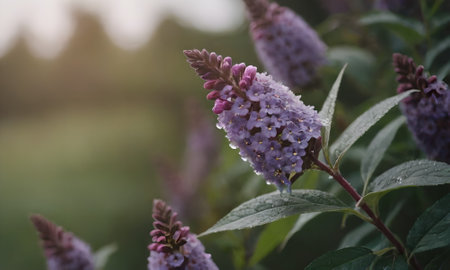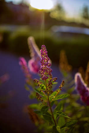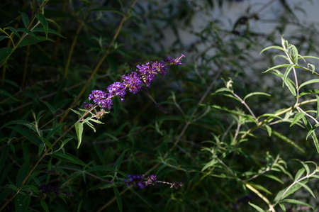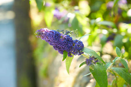 Beautiful purple flowers of Summer lilac (Buddleja davidii) in garden at sunset