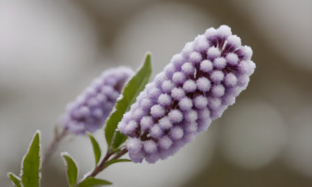 Close-up of a purple flower with white frost on it.