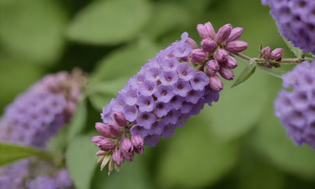 beautiful purple buddleja flower on green background, butterfly bush