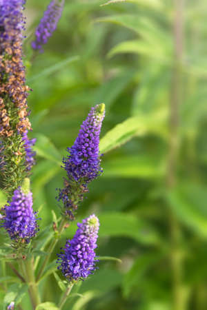 Long blue flowers Veronica spicata in a flower bed. Perennial herbaceous ornamental plant. Gardening and landscape design.