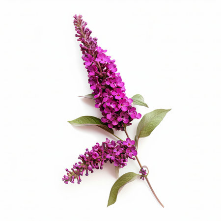 Closeup of buddleia davidii flower and leaves on white background