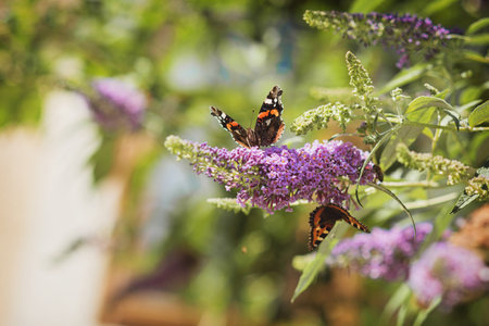 Red Admiral, Vanessa atalanta, butterflies on Buddleja flower or butterfly bush. High quality photo