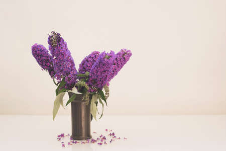 bouquet of purple lilac color stands in a metal vintage measuring cup on a light beige background