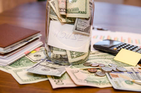 Monthly budget notebook next to banknotes, coins and jar full of rolled up receipts. Increase in tariffs and prices.