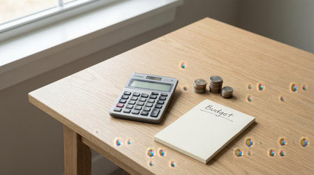 A wooden table hosts a calculator and a stack of coins next to a notepad labeled Budget. Natural light fills the room, creating a clear workspace for financial planning.