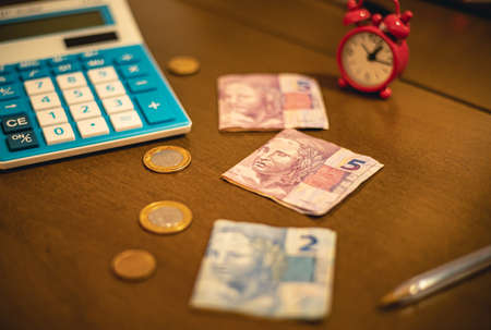calculating bills for month, budget is limited. only some cash is in a wallet on a table. coffee helps to concentrate