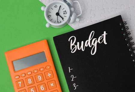 Calculator with the word BUDGET on the display. Pen, eyeglasses and notepad on the diagrams. Concept photo