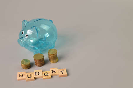 Piggy bank, stack of coins and wooden blocks with text BUDGET.
