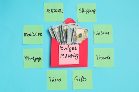 Budget planning concept. Top view of notepad with word Budget, and money on blue background. US dollar banknotes in the red envelope,