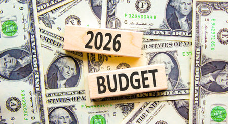 Budget 2026 symbol. Concept words Budget 2026 on beautiful wooden blocks. Beautiful dollar bills background. Dollar bills. Business and budget 2026 concept. Copy space.
