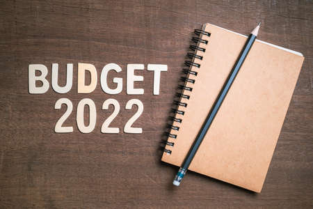 Budget 2022 text by wooden letters with small notebook and pencil, budget and investment plan in 2022