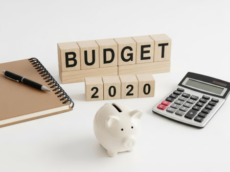 The image depicts a carefully arranged setup for budget planning for the year 2020. Central to the image is the word 'BUDGET' spelled out with wooden blocks, accompanied by the year '2020' below it. To the left of the blocks, there is a spiral-bound notebook with a pen resting on top, suggesting note-taking or planning. To the right, a calculator is placed, indicating financial calculations. In the foreground, a white piggy bank is positioned, symbolizing savings. The entire setup is laid out on a clean, white surface, emphasizing the focus on financial organization and planning.