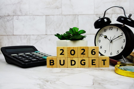 Budget 2026 with wooden blocks alphabet letters and stationery accessories on marble background
