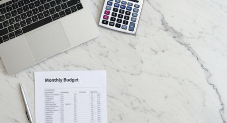 On the marble table is a laptop, calculator, pen and a “Monthly Budget†form for financial planning. View from above. Space for text.