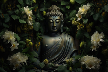 Serene Buddha statue in meditation surrounded by vibrant floral blooms in a peaceful temple garden.