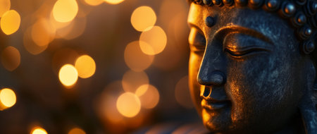 Buddha statue with golden bokeh background, close up