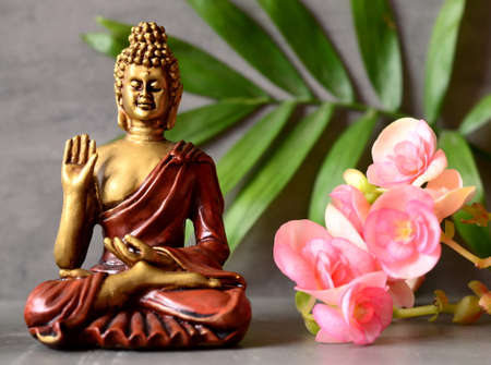 Buddha is sitting in ZEN garden with flower and palm