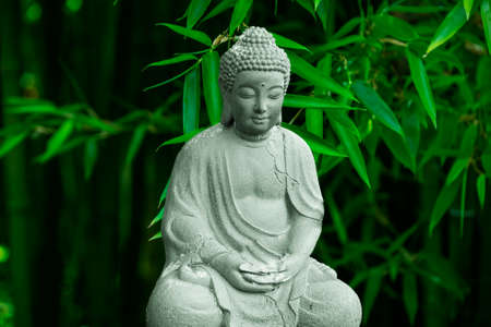 Portrait of a buddha statue before a bamboo background. Sign for peace and wisdom