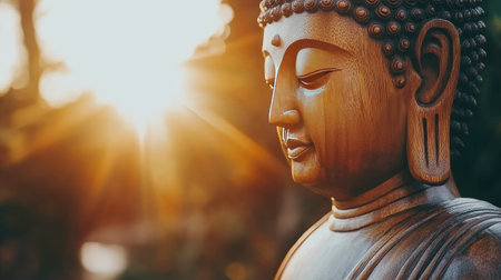 A beautifully carved wooden Buddha statue bathed in warm sunlight. The image captures the serene expression and intricate details, creating a peaceful atmosphere perfect for spiritual reflection and calmness.