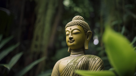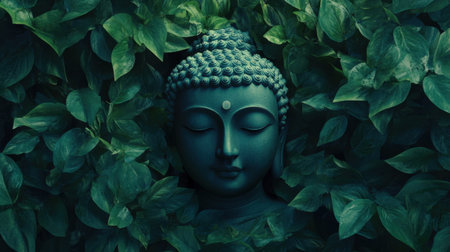 A serene Buddha statue emerges amidst lush green leaves, symbolizing tranquility and peace. This tranquil setting invites mindfulness and relaxation.