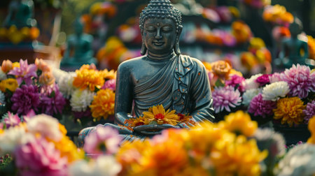 Buddha Statue Adorned with Vibrant Flowers, Emblematic of Devotion and Peace.