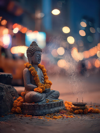 A tranquil Buddha sculpture adorned with vibrant flowers and soft incense smoke. Captured in an urban evening, this image evokes peace and serenity, perfect for spiritual themes.
