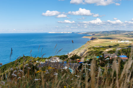 Eype Beach, UK - July 25, 2020: Scenic view over the flowers of Eype Beach, a secluded and unspoiled beach on Dorset’s Jurassic Coast, coastline and and the carpark. Selective focus.