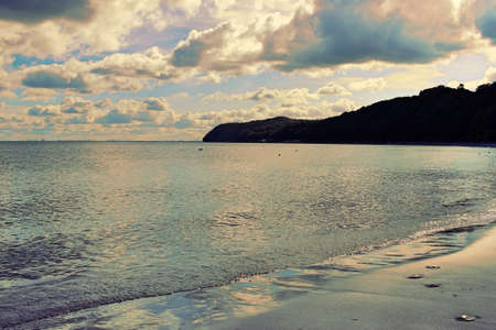 The beach in Gdynia on the Baltic Sea at sunset. In the background, the Orlowski headland with a cliff. Colorful clouds in the sky