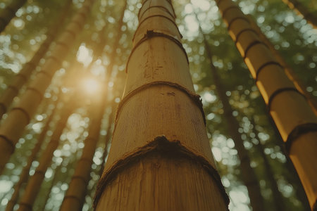 Golden sunlight filters through tall bamboo trunks, creating a tranquil, serene forest atmosphere
