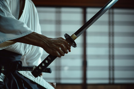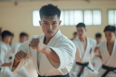 Karate practitioner performs perfect kata in Dojo., generative AI