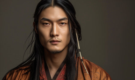 Portrait of young Asian man with dark long hair in traditional clothes looking at camera