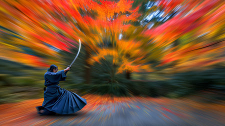 Blurred Autumn Motion. Samurai Warrior With Katana Sword Practicing Traditional Martial Arts, Japan.