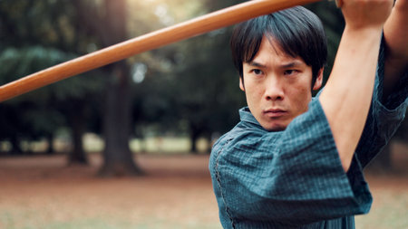 Bokken, Japanese man and outdoor for martial arts in training, exercise and sports as athlete. Male person, culture and ready with bamboo sword, combat and practice for defense technique with bojutsu
