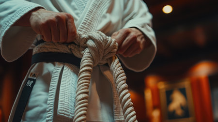 Martial Artist Tying Black Belt: Symbol of Dedication and Mastery in Martial Arts Practice