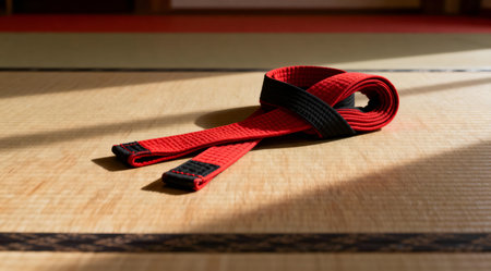 A martial arts belt, colored in traditional black, lies gracefully on a textured wooden dojo floor. The scene is illuminated by soft, ambient lighting that highlights the belt's fabric and the wood's grain, creating a serene and focused atmosphere. Ideal for use in sports-related publications or as a symbolic representation of martial arts discipline. AI-generated illustration.