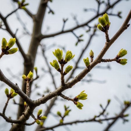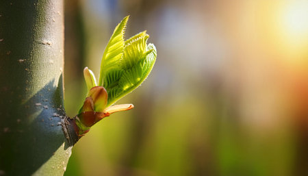Close up image of a new leaf budding on a tree branch, symbolizing fresh starts, growth, and new beginnings.