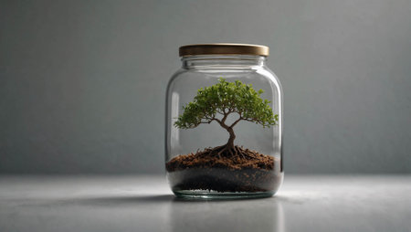 One small tree growing inside a clear glass jar on a white surface. Represents preservation of nature in a controlled, simple setting. Copy space.