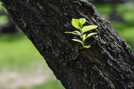 Young tree sprout growing from the big tree trunk with sunlight spot. New life, Ecology concept, Close-up.